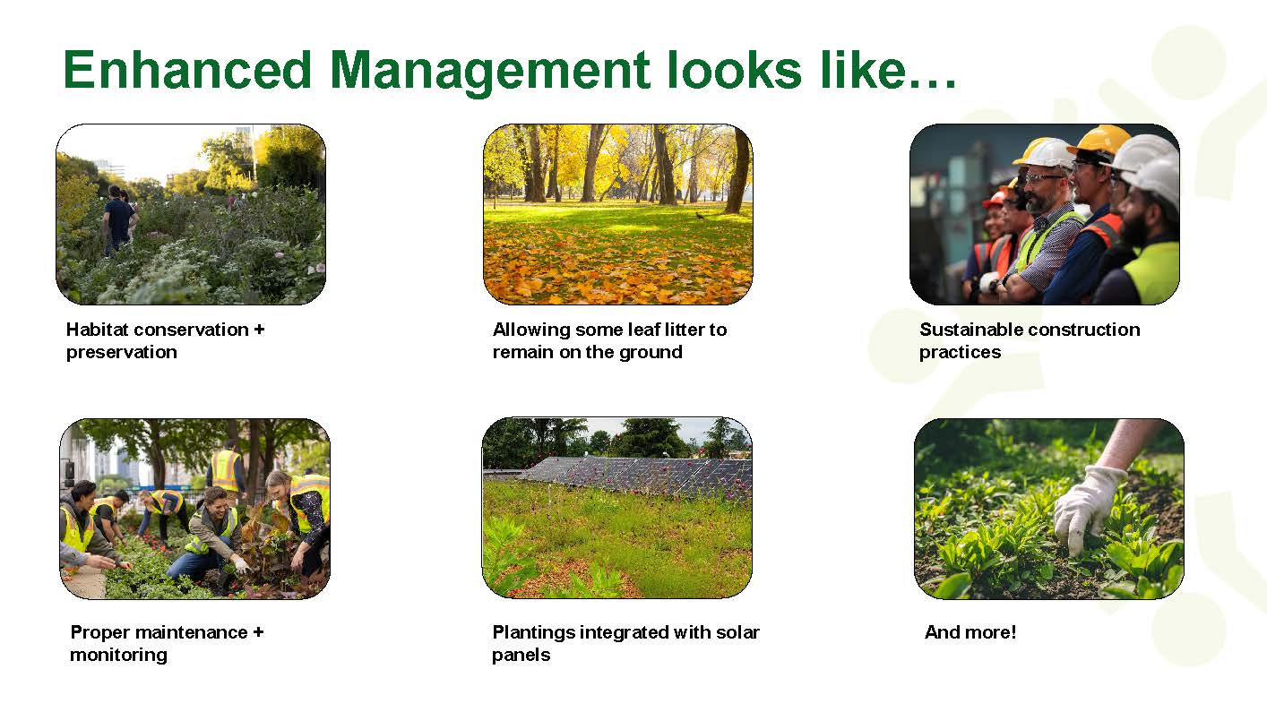 - Enhanced management refers to actions related to the care and maintenance of open spaces that are intended to support biodiversity as well as ecological health and function